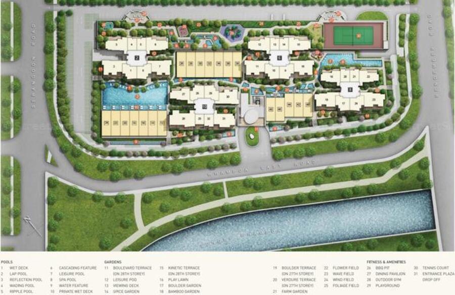 Facilities at Eight Riversuites include Wet Deck, Lap Pool, BBQ Pit, Leisure Pod, Sun Deck, Kinetic Garden, Reflection Pool, Wading Pool, Play lawn, Bamboo Garden, Playground, Jacuzzi, Dining Pavilion, Outdoor Gym, Spa Pool, Tennis Court and Spice Garden.