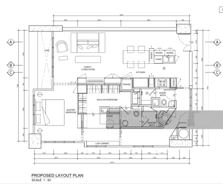 893 sq ft (original 2 bedroom + 3 toilet, converted to spacious 1 bedroom + study + walk in wardrobe + 2 toilet)
