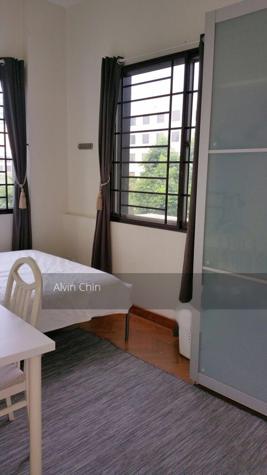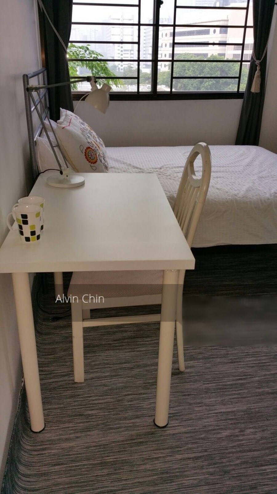 Common bedroom with windows furnished with Queen Bed, writing table, wardrobe and Aircon.