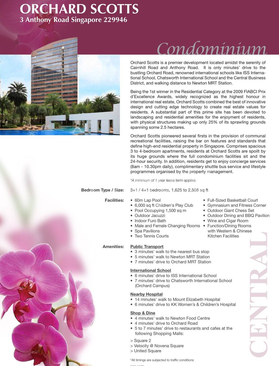 Orchard Scotts pioneered several firsts in the provision of communal recreational facilities, raising the bar on features and standards that define high-end residential property in Singapore. Comprises spacious 3 to 4-bedroom apartments, residents at Orchard Scotts are spoilt by its huge grounds where the full condominium facilities sit and the 24-hour security. In addition, residents get to enjoy concierge services (8am - 10.30pm daily), complimentary shuttle bus service and lifestyle programmes organised by the property management.