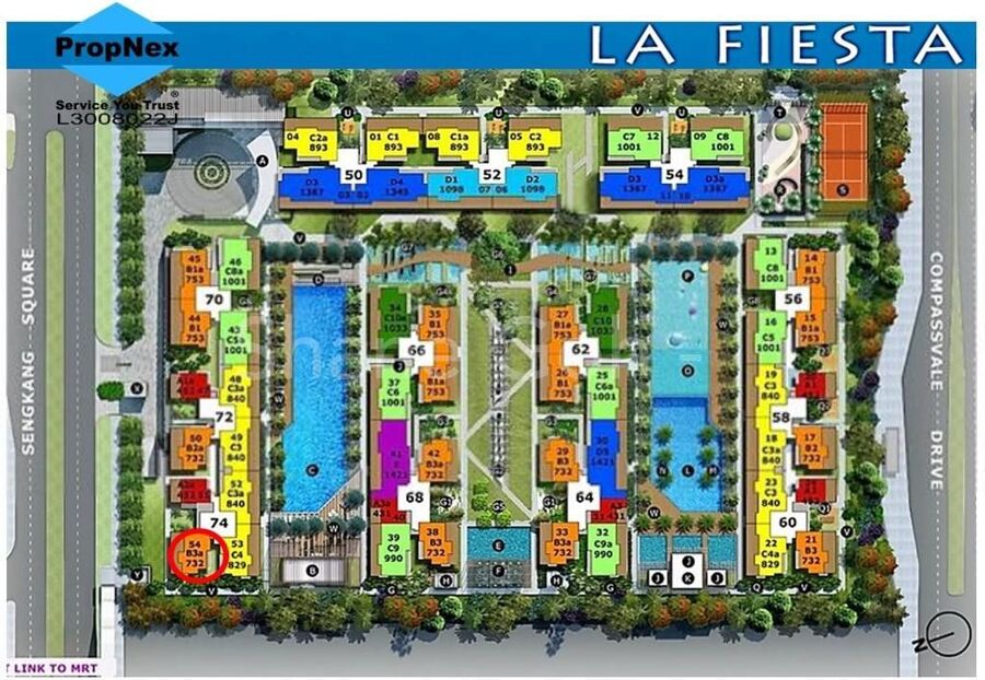 FACILITIES - 50m Lap Pool, BBQ, Clubhouse, Gym, Pavilions, Tennis Court, Aqua Gym, Children's Playground, Fun Pool, Outdoor Fitness. La Fiesta is DIRECTLY CONNECTED to Sengkang MRT, Bus Interchange and Compass Point through COVERED LINKWAY. SengKang Sq with grocery and retail shopping, bank, eateries, NTUC Supermarkets & more.