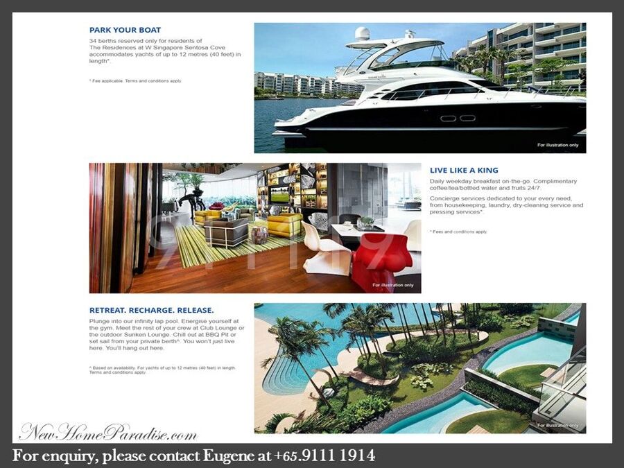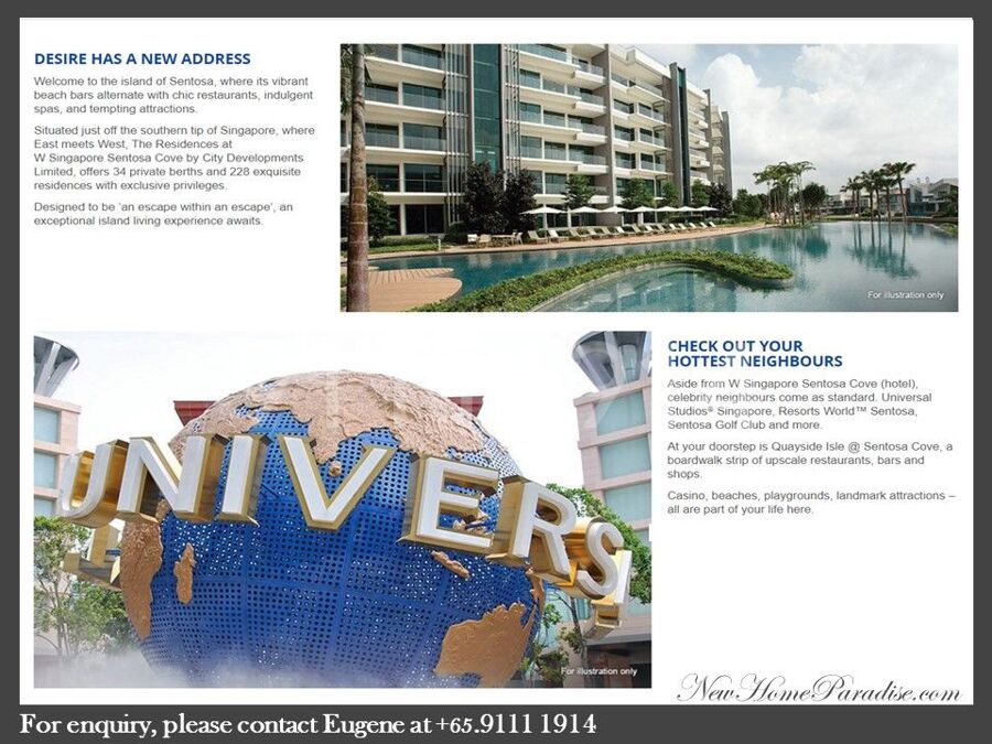 Residences @ W is the only branded residences and integrated development project in this exclusive enclave of Singapore on Sentosa Cove. With the Hotel, Retail, F&B and Specialty shops integrated under 1 roof; occupiers will enjoy the panoramic waterfront Living, yet are just minutes away from amenities, available right at its doorsteps.