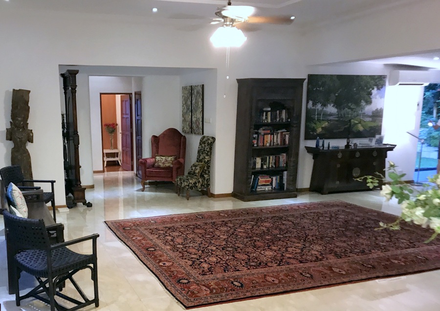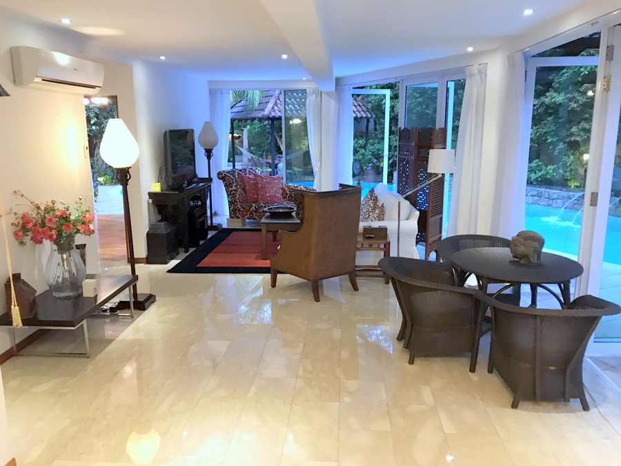 Large living hall and dining hall that opens to the pool.