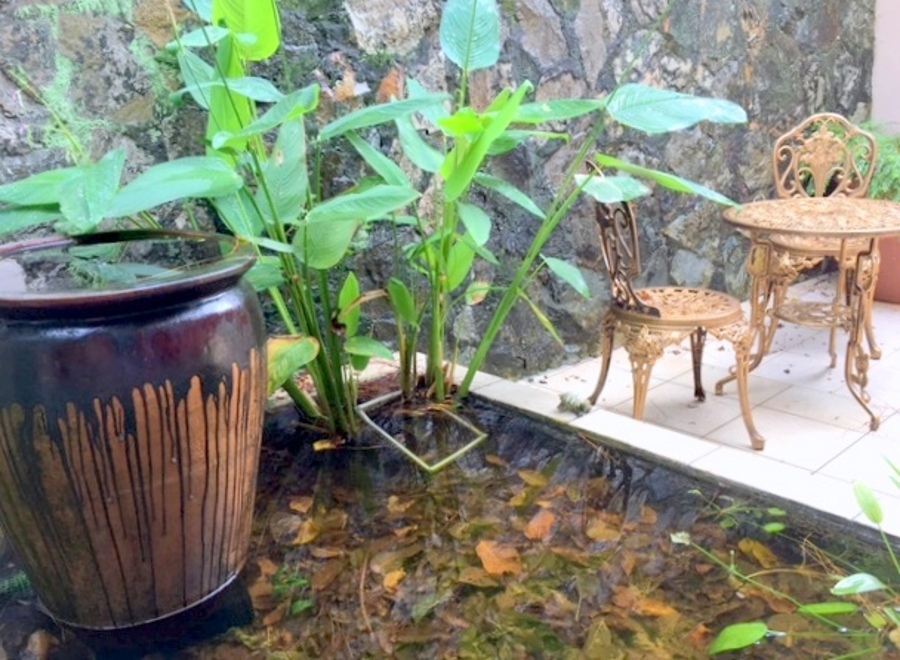 A large koi pond front the house with a short bridge into the house.