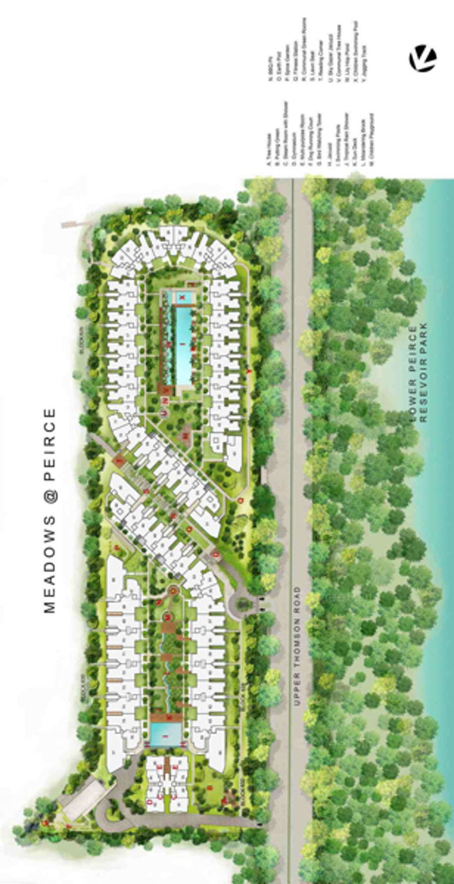 Facilities at Meadows @ Peirce include swimming pool, Jacuzzi, sauna, BBQ pits, gym, basketball practice court, jogging track, putting green, meeting room, and playground.
